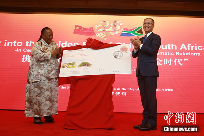 當(dāng)?shù)貢r間12月12日,中國駐南非大使館隆重舉行慶祝中國和南非建交25周年招待會。圖為中國駐南非大使陳曉東同南非外長潘多爾為中南建交25周年紀念封揭幕。 中新社記者 王曦 攝