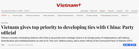 中國日?qǐng)?bào)網(wǎng)12月14日電 12月12日,中國和越南共同宣布中越兩黨兩國關(guān)系新定位,在深化中越全面戰(zhàn)略合作伙伴關(guān)系基礎(chǔ)上,攜手構(gòu)建具有戰(zhàn)略意義的中越命運(yùn)共同體。國際媒體對(duì)中越關(guān)系新定位進(jìn)行了密集報(bào)道,認(rèn)為雙邊關(guān)系更加重要,中越兩黨兩國關(guān)系邁上新臺(tái)階。