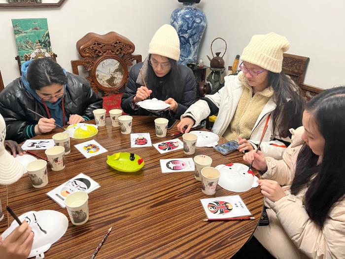 參觀完天壇之后,活動的下一站是在老北京胡同里體驗戲劇臉譜繪制。在了解臉譜文化的起源與發(fā)展后,留學生們紛紛對“紅臉關公” “白臉曹操”感到新奇,大家迫不及待地圍坐在小桌前,一筆一劃地勾勒出屬于自己的臉譜,一個個惟妙惟肖。