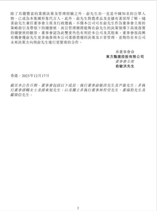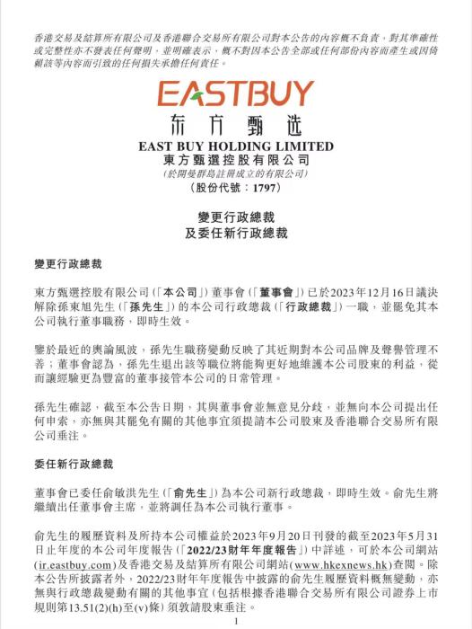 中新網(wǎng)12月18日電 12月18日,東方甄選開盤后股價大漲,截至發(fā)稿時,漲超10%。當(dāng)日凌晨,東方甄選微博賬號發(fā)布的直播預(yù)告海報(bào)顯示,董宇輝的身份已成為“東方甄選高級合伙人”。12月17日,東方甄選發(fā)布公告稱,董事會已于12月16日議決解除孫東旭的行政總裁一職,并罷免其公司執(zhí)行董事職務(wù),即時生效。(中新財(cái)經(jīng))