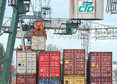 在德國多特蒙德港,機械設(shè)備在吊裝集裝箱。