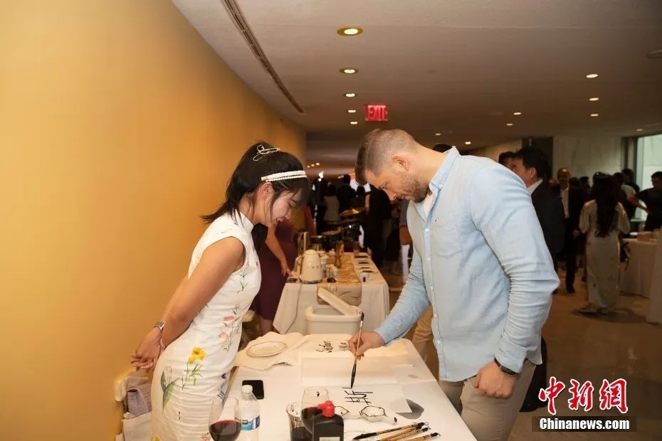 資料圖:當?shù)貢r間6月29日晚,“何以文明”特展發(fā)布儀式在紐約聯(lián)合國總部舉行,與會嘉賓體驗中國書法。中新社記者 廖攀 攝