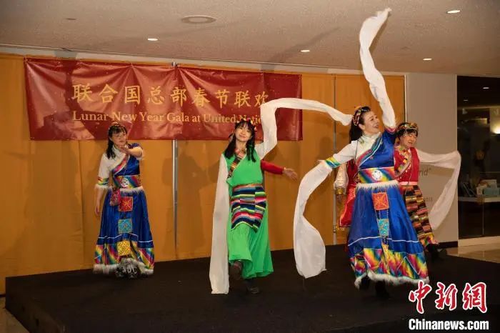 資料圖:當?shù)貢r間1月20日,聯(lián)合國中國書會舞蹈團在紐約聯(lián)合國總部舉辦的春節(jié)聯(lián)歡晚會上表演《格桑拉》。中新社記者 廖攀 攝