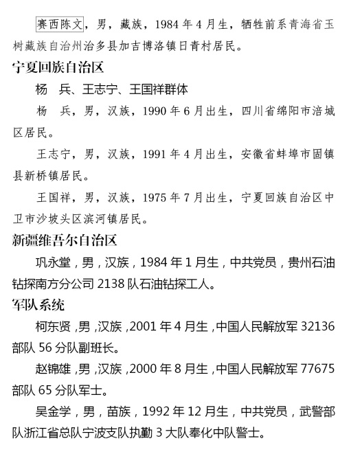 上榜勇士中有勇斗持刀犯罪嫌疑人身負(fù)重傷的張照杰、姚玉龍、王沖、王永芳;有從高橋跳水救人的周中磊、曾文文、周海;有從隨時可能爆炸的事故車輛中救出司機母子的湯益鑫;有冒著煤氣罐爆炸危險制服劫持孩子歹徒的蔡國榮;有救援被困電梯內(nèi)同事而導(dǎo)致左小腿截肢的翟元敏;有休假期間水下連續(xù)救人的現(xiàn)役軍人柯東賢、吳金學(xué)、趙錦雄;更有見義勇為英勇犧牲的李偉倫、張嘉俊、張可可、李峰武、安西德、何同猛、曾維龍、胡喜明、李振華、東周才仁、賽西陳文11位同志。勇士們見義勇為事跡鼓舞人心、振奮精神、催人奮進。他們用血汗甚至生命秉承、詮釋了中華民族傳統(tǒng)美德,用奮不顧身的實際行動踐行了社會主義核心價值觀。