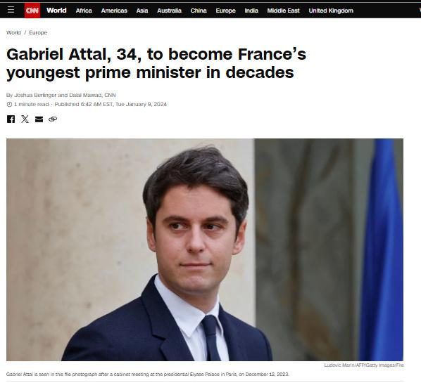 據(jù)報(bào)道,現(xiàn)任法國(guó)國(guó)民教育和青年部長(zhǎng)阿塔爾,將成為自1958年法蘭西第五共和國(guó)成立以來該國(guó)最年輕的總理。