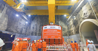 2023年6月10日,工人在巴基斯坦蘇吉吉納里水電站吊裝最后一臺(tái)機(jī)組轉(zhuǎn)子。