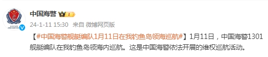 中新網(wǎng)1月11日電 據(jù)中國海警局官方微博消息,1月11日,中國海警1301艦艇編隊在我釣魚島領海內(nèi)巡航。這是中國海警依法開展的維權巡航活動。