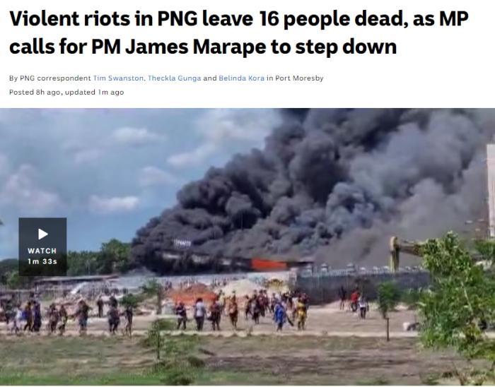 據(jù)澳大利亞廣播公司(ABC)報道,當天,巴新部分民眾利用警察罷工的機會縱火焚燒商店和企業(yè)設施,目前騷亂已造成16人遇難,其中首都莫爾斯比港有9人死亡,第二大城市萊城則有7人死亡。