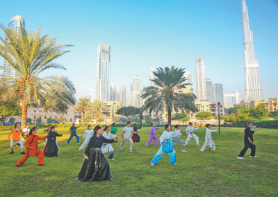 每到周末,世界最高建筑——阿聯(lián)酋迪拜哈利法塔附近的草坪上,一群身穿中式練功服的民眾排成隊(duì)列,伴著舒緩的中國(guó)古典民樂(lè),起勢(shì)、野馬分鬃、白鶴亮翅……如今,越來(lái)越多民眾自發(fā)前來(lái)學(xué)習(xí)太極拳、太極劍、太極扇等,經(jīng)常性參加太極拳練習(xí)活動(dòng)的就有來(lái)自50多個(gè)國(guó)家和地區(qū)的近200人。
