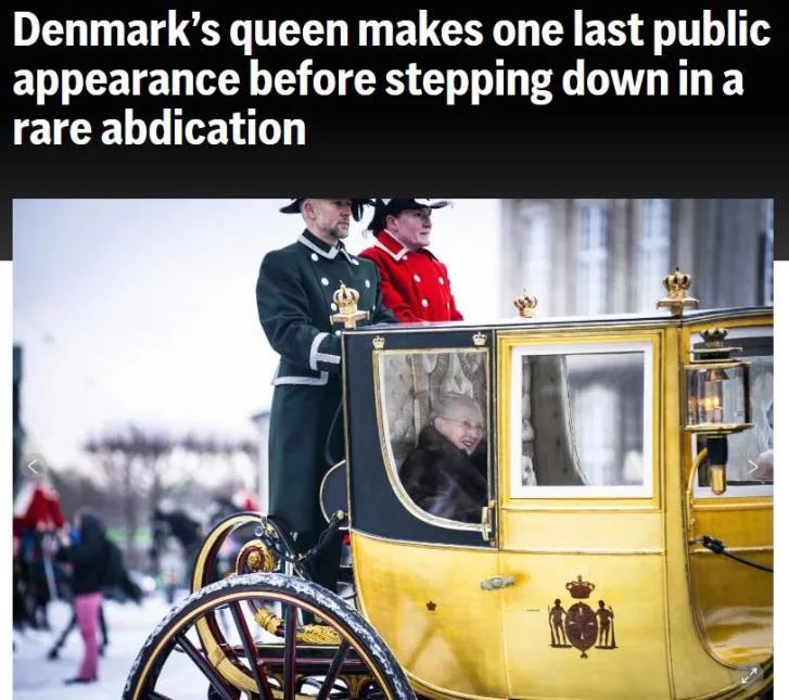 當(dāng)?shù)貢r間1月4日,是丹麥女王瑪格麗特二世最后一次以君主身份公開露面。現(xiàn)年83歲的女王乘坐“金馬車”穿過丹麥?zhǔn)锥?,不少民眾冒著?yán)寒、強(qiáng)風(fēng)和雨雪,在沿途為她揮舞旗幟并歡呼。