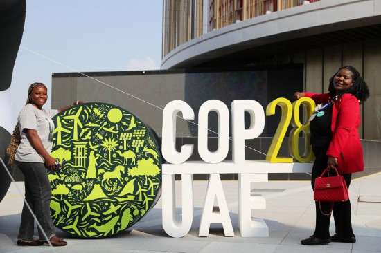 2023年12月3日,人們?cè)诼?lián)合國(guó)氣候變化迪拜大會(huì)“綠區(qū)”的大會(huì)標(biāo)識(shí)旁合影。新華社記者王東震攝