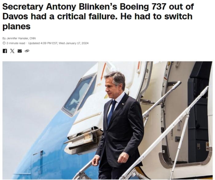 中新網(wǎng)1月18日電 據(jù)美國有線電視新聞網(wǎng)(CNN)報道,當(dāng)?shù)貢r間1月17日,美國國務(wù)卿布林肯參加完達(dá)沃斯論壇從瑞士蘇黎世返程時,其乘坐的波音737飛機(jī)出現(xiàn)“嚴(yán)重故障”。