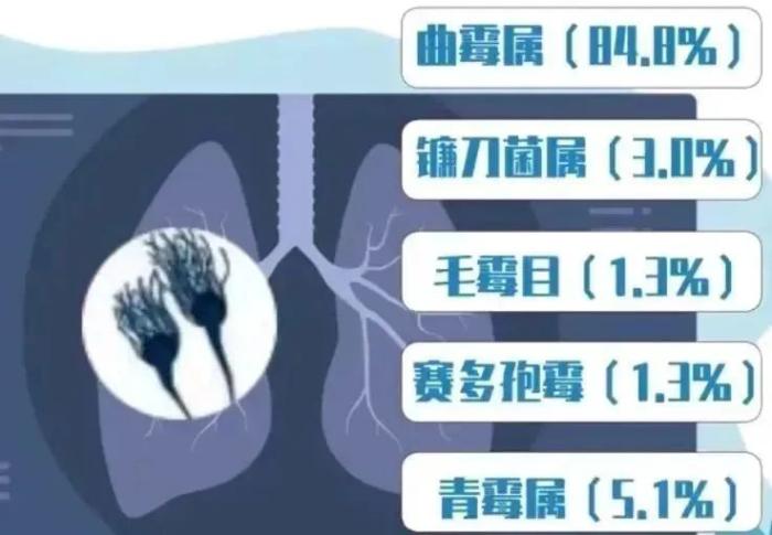 一項發(fā)表在《協(xié)和醫(yī)學雜志》上的我國霉菌感染流行病學分析的多中心回顧性研究顯示,以曲霉屬引起的感染占比最高為84.8%,其次是鐮刀菌屬、毛霉目和賽多孢霉等霉菌造成的感染,在霉菌引起的常見感染性疾病中以下呼吸道、耳部、眼部和皮膚感染較多見。