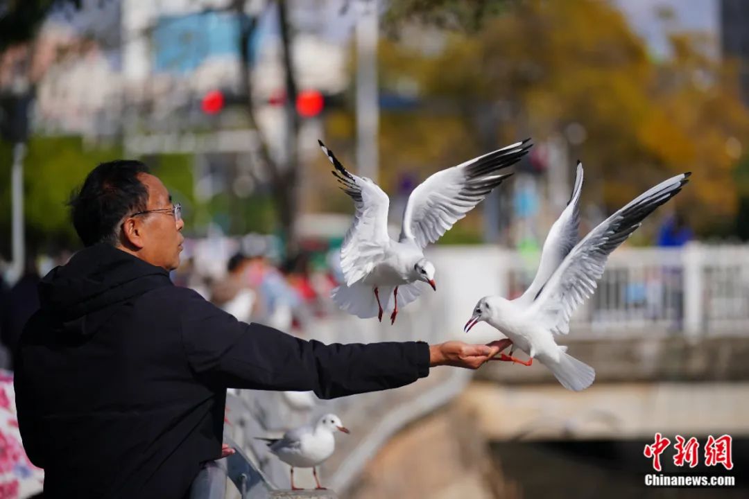 云南昆明市民在大觀河邊喂紅嘴鷗。劉冉陽(yáng) 攝