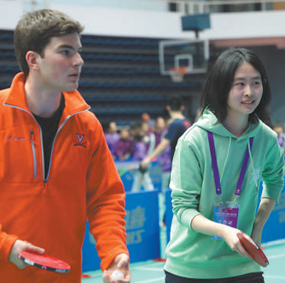 1月6日上午,清華大學(xué)綜合體育館內(nèi),加油聲此起彼伏。來(lái)自弗吉尼亞大學(xué)和清華大學(xué)的學(xué)生聯(lián)合組隊(duì),進(jìn)行多輪次乒乓球混合雙打比賽。小小的乒乓球來(lái)回穿梭,兩國(guó)青年通力配合,贏得陣陣掌聲。
