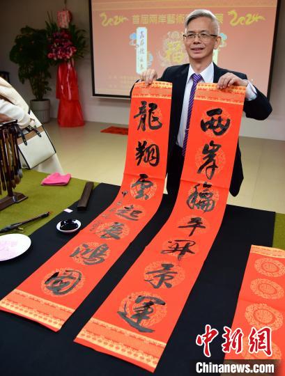 1月28日,兩岸藝術(shù)家春聯(lián)展在臺(tái)北江山如此多嬌藝術(shù)館舉行。圖為臺(tái)灣中華書道學(xué)會(huì)理事長楊旭堂當(dāng)場(chǎng)揮毫?xí)鴮憽皟砂逗推介_景運(yùn),龍翔云起展鴻圖”。中新網(wǎng)記者 路梅 攝