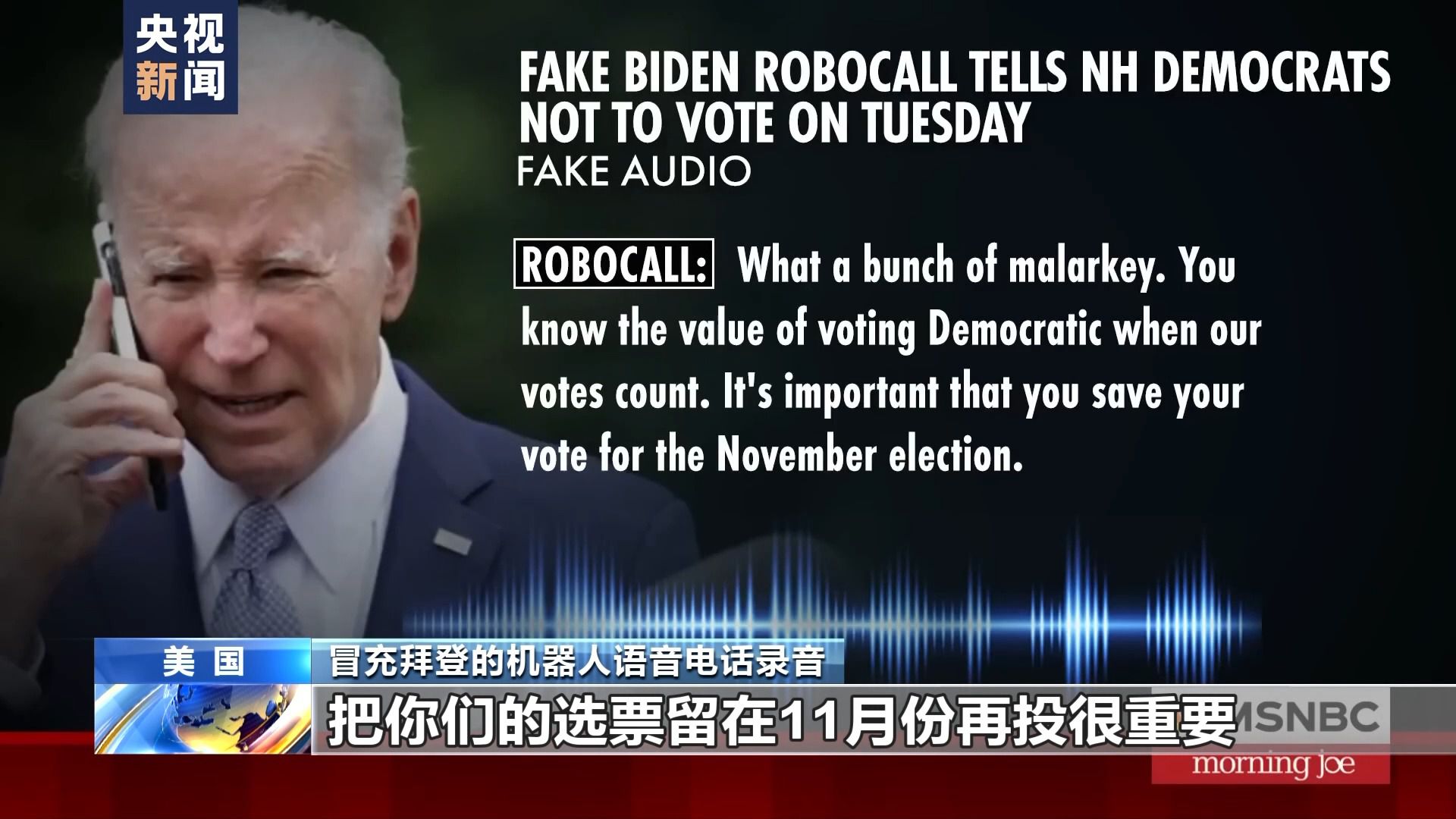 冒充拜登的機器人語音電話錄音:把你們的選票留在11月份再投很重要。在這周二(23日)投票,只會讓共和黨人得逞,讓特朗普再次當選為共和黨候選人。