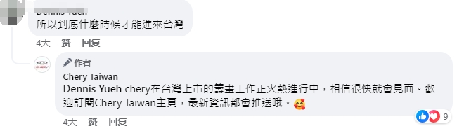 早前,奇瑞官方在臉書創(chuàng)立“Chery Taiwan”,并從去年開始更新專業(yè)內(nèi)容,針對一款中型運動型多用途汽車已多次發(fā)布宣傳影片。有不少臺灣網(wǎng)友在該賬號咨詢該款汽車何時會在臺灣上市,該賬號回復(fù),目前在臺灣上市的籌劃工作正火熱進行中,相信很快就會見面。