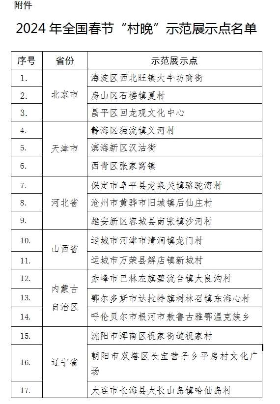 中新網(wǎng)2月1日電 據(jù)文化和旅游部網(wǎng)站消息,文化和旅游部辦公廳近日發(fā)布《關(guān)于公布2024年春節(jié)“村晚”示范展示點名單的通知》,根據(jù)文化和旅游部春節(jié)活動有關(guān)部署,在各省級文化和旅游行政部門申報推薦的基礎(chǔ)上,文化和旅游部研究確定了2024年春節(jié)“村晚”示范展示點名單。