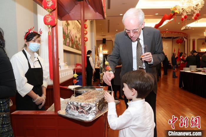 當?shù)貢r間2月1日晚,加拿大首都渥太華,中國駐加拿大大使館舉行2024年春節(jié)招待會。圖為現(xiàn)場制作的中國風(fēng)味小吃冰糖葫蘆吸引來賓品嘗。中新網(wǎng)記者 余瑞冬 攝