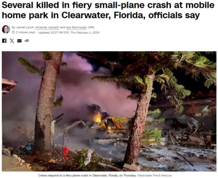 中新網(wǎng)2月2日電 據(jù)美國有線電視新聞網(wǎng)(CNN)報道,當?shù)貢r間2月1日晚,一架小型飛機在美國佛羅里達州克利爾沃特市的一處公園墜毀。