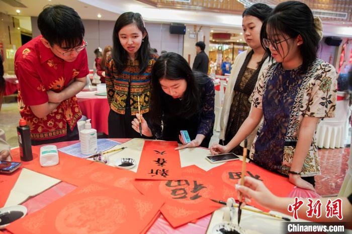2月3日,廣西民族大學(xué)舉辦留學(xué)生春節(jié)團(tuán)拜會活動。圖為留學(xué)生在寫春聯(lián)。陳冠言 攝