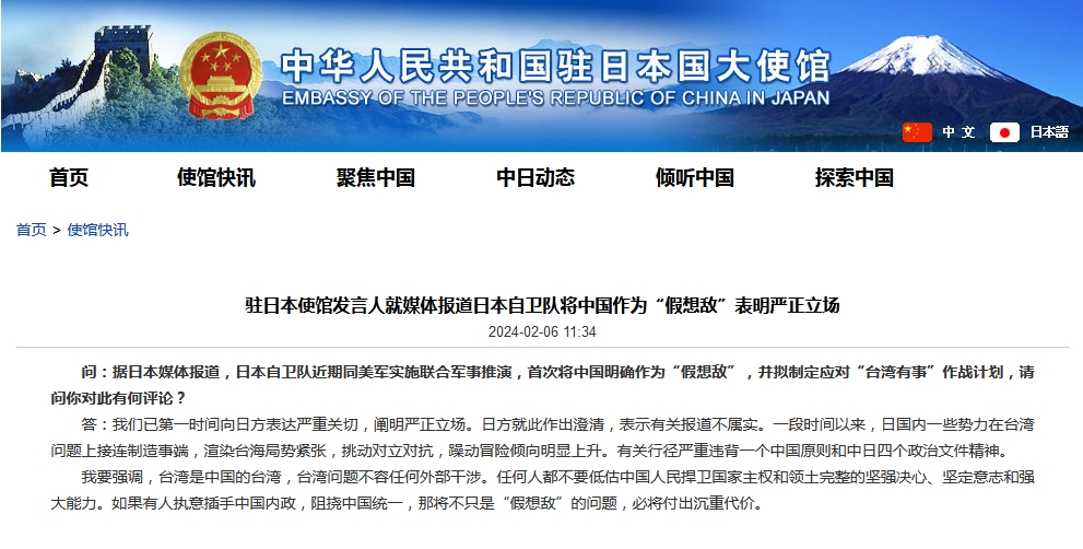 駐日使館就媒體報(bào)道日本自衛(wèi)隊(duì)將中國作為“假想敵”表明嚴(yán)正立場