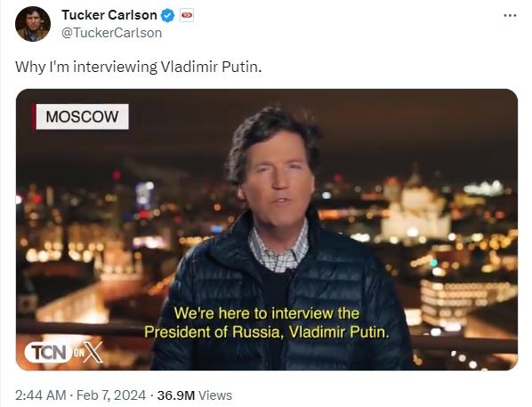據(jù)介紹,卡爾森是??怂闺娨暸_的一名當紅主播,主要負責一檔名為《卡爾森今夜秀》的新聞節(jié)目。他在2023年4月被??怂菇夤?,隨后在社交平臺X上繼續(xù)發(fā)布采訪節(jié)目。路透社稱,卡爾森2023年8月在X上發(fā)布的對美國前總統(tǒng)特朗普的采訪獲得了上億播放量。