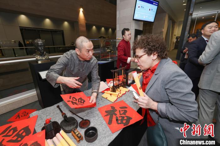 當(dāng)?shù)貢r間2月6日晚,加拿大蒙特利爾,中國駐蒙特利爾總領(lǐng)館與中國常駐國際民航組織理事會代表處在國際民航組織(ICAO)總部聯(lián)合舉辦“共慶春節(jié)”主題活動。圖為當(dāng)?shù)厝A人書法家(左)向與會嘉賓講解以中國書法書寫的“?!弊帧!≈行律缬浾? 余瑞冬 攝