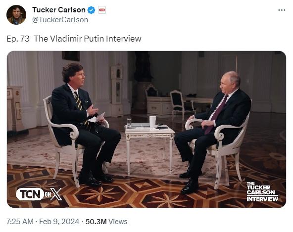 上線前,這場采訪就在世界范圍內(nèi)引發(fā)關(guān)注。有媒體稱,這次采訪或?qū)⒊蔀?022年烏克蘭危機(jī)爆發(fā)后,美國媒體人對普京進(jìn)行的首個正式訪問。相關(guān)通告已在社交媒體上獲得了網(wǎng)友的上億次瀏覽量。