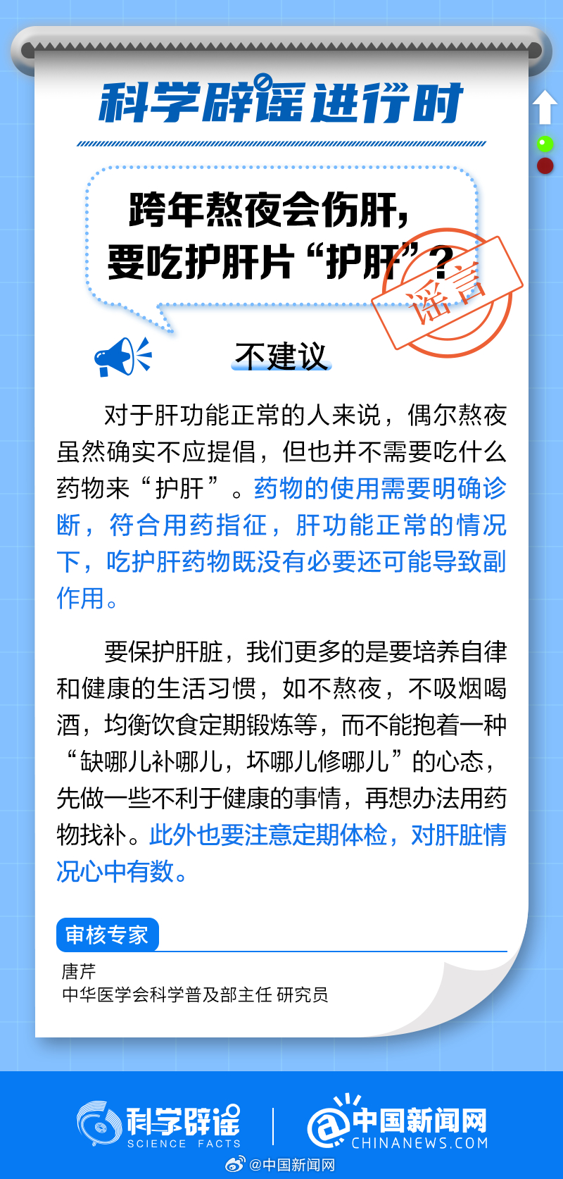 中新網(wǎng)2月10日電 對(duì)于肝功能正常的人來說,偶爾熬夜不需要吃什么藥物來“護(hù)肝”。藥物的使用需要明確診斷,符合用藥指征,肝功能正常的情況下,吃護(hù)肝藥物既沒有必要還可能導(dǎo)致副作用。要保護(hù)肝臟,我們更多的是要培養(yǎng)自律和健康的生活習(xí)慣,如不熬夜、不吸煙喝酒、均衡飲食、定期鍛煉等。(來源:@科學(xué)辟謠 中國(guó)新聞網(wǎng)微博)