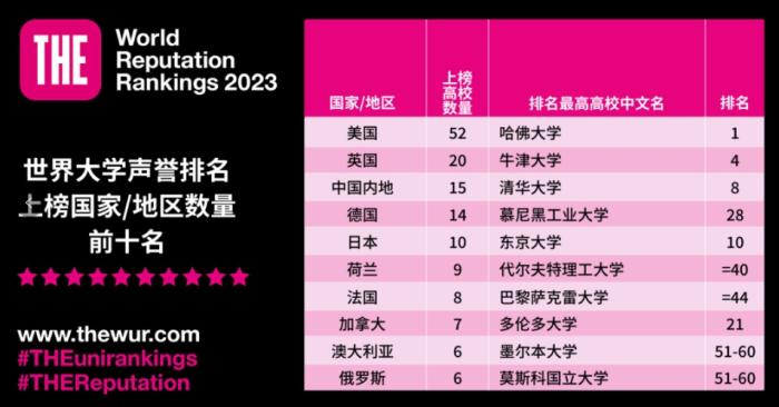 美國有52所高校躋身榜單,較2022年減少了4所。英國的院校數量居次,共有20所高校入選,同樣較2022年減少了4所。