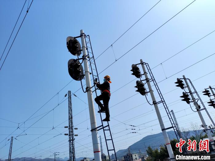 圖為安康東電務(wù)車間職工正在進(jìn)行高柱信號機檢修。王建滆攝