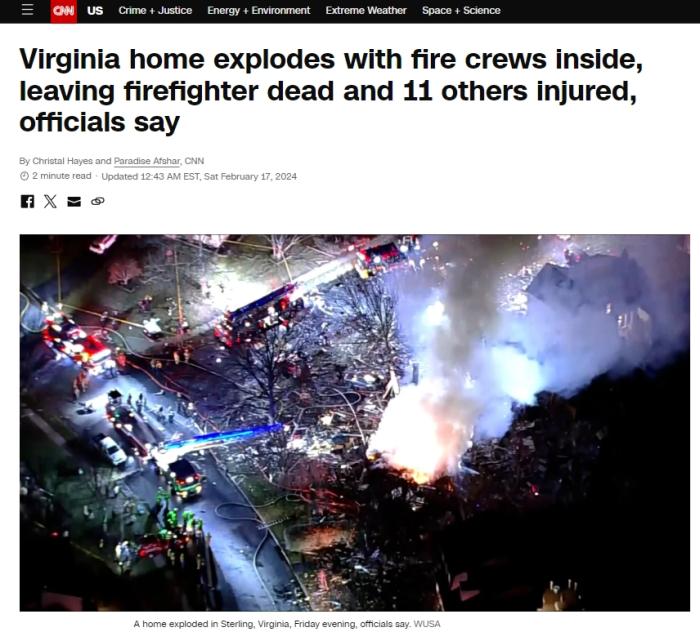 中新網(wǎng)2月17日電 綜合美媒報(bào)道,當(dāng)?shù)貢r(shí)間16日,美國(guó)弗吉尼亞州一所房屋發(fā)生爆炸,已致1名消防員死亡,另有11人受傷,其中包括9名消防員。