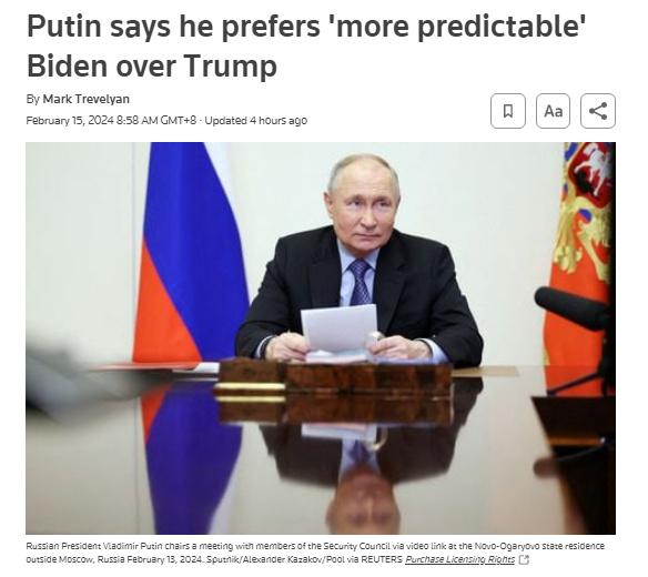 據(jù)報(bào)道,這是普京首次公開評論2024年美國大選。當(dāng)被問及兩人誰當(dāng)選對俄羅斯“更有利”時(shí),普京回應(yīng):“拜登,他更有經(jīng)驗(yàn)、更有預(yù)見性,是一位老派政治家。”
