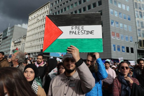 2023年10月22日,示威者在比利時(shí)布魯塞爾歐盟總部附近舉行集會,聲援巴勒斯坦。新華社記者趙丁喆攝