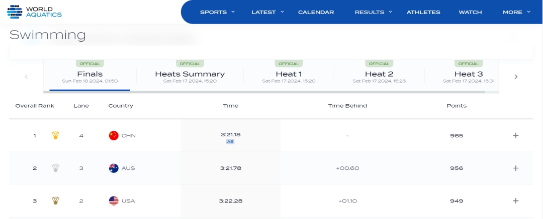 在預(yù)賽中,中國隊便狀態(tài)不俗,游出了3分24秒47的成績,打破了由日本隊保持的亞洲紀錄(3分24秒67),排名第一晉級決賽。