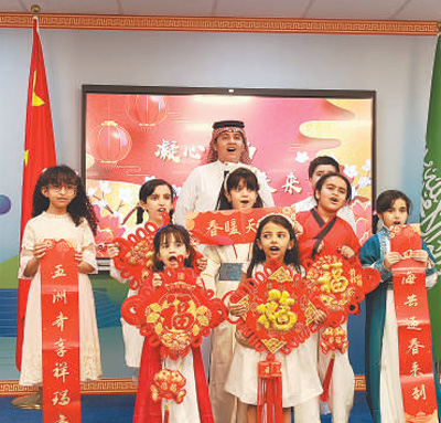 2月1日,在沙特阿拉伯智慧宮中文教育學(xué)院吉達(dá)學(xué)院,孩子們用中文合唱歌曲《新年好》。
