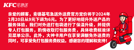 肯德基官網(wǎng)顯示,肯德基宅急送外送費(fèi)官方定價(jià)將于2024年2月20日從9元下調(diào)為6元。同時(shí),肯德基稱,為了更好地提升外送產(chǎn)品的服務(wù)體驗(yàn),對外送打包袋進(jìn)行了保溫升級,并提供專人打包服務(wù),酌情收取打包服務(wù)費(fèi)。此外,大神卡用戶在享受滿額免外送費(fèi)的同時(shí),可享受免打包服務(wù)費(fèi)權(quán)益。
