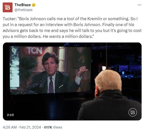 美記者卡爾森爆料:英前首相約翰遜采訪要價(jià)100萬(wàn)美元!
