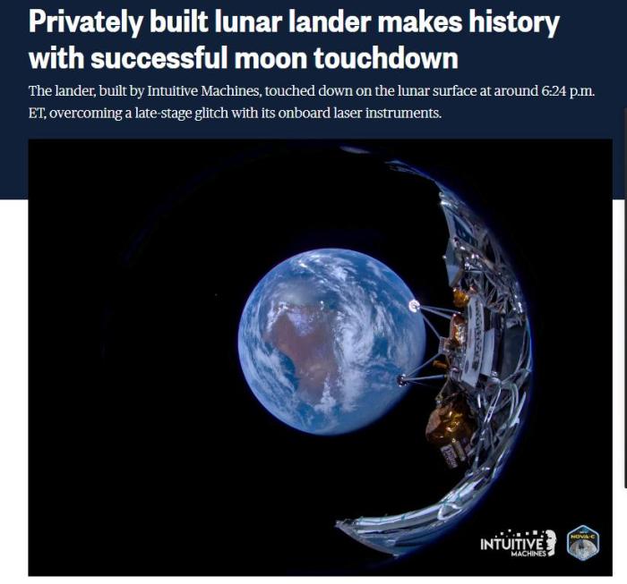 據報道,由“直覺機器” 研發(fā)的著陸器于美東時間下午6點23分左右降落在月球表面。該著陸器是自1972年“阿波羅17號”任務以來第一艘登上月球的美國航天器。