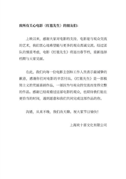 果然,上映6天后,《紅毯先生》宣布撤檔,表示“期待能在更恰當?shù)臅r間,遇到愿意和我們共同完成這部作品的你”。事實上,這已是該片第二次更換檔期,原本定的上映日期是2023年11月17日。