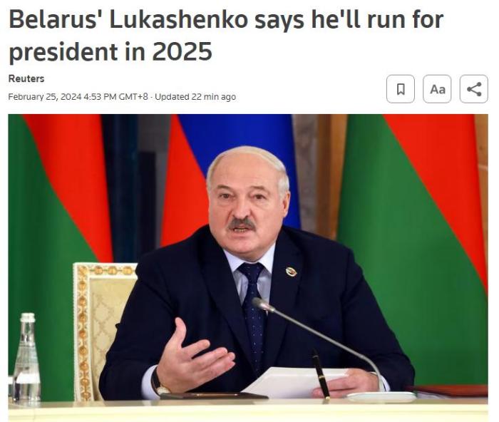 中新網(wǎng)2月25日電 據(jù)路透社援引白俄羅斯媒體25日報(bào)道,白俄羅斯總統(tǒng)盧卡申科表示,他計(jì)劃參加于2025年舉行的總統(tǒng)選舉。