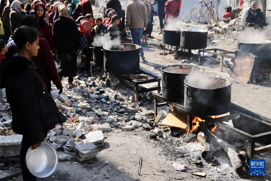 2月27日,在加沙地帶北部的杰巴利耶難民營,人們等待領(lǐng)取食物。新華社發(fā)(穆罕默德·阿里攝)