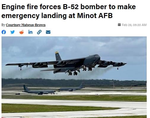 中新網(wǎng)2月28日電 據(jù)美國(guó)《空軍時(shí)報(bào)》網(wǎng)站報(bào)道,當(dāng)?shù)貢r(shí)間2月27日,美國(guó)軍方稱,一架B-52H型戰(zhàn)略轟炸機(jī)日前在飛行途中發(fā)動(dòng)機(jī)起火,被迫緊急降落邁諾特空軍基地。