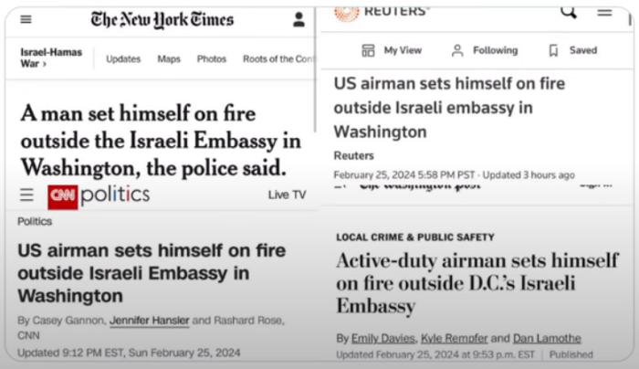正常一則報道,標(biāo)題最好是能以最高效的方式聚合“時間地點(diǎn)人物起因經(jīng)過結(jié)果”諸要素(因?yàn)槭恰靶侣劇?,時間要素反而可以選擇弱化),而在西方主流媒體對這次自焚抗議事件的第一批報道中,標(biāo)題基本都只有“地點(diǎn)人物結(jié)果”三個要素,即《某人在以色列使館自焚》這樣的表達(dá),最多會加一個“空軍”或“現(xiàn)役空軍”的人物身份。