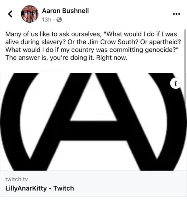 但最近的消息,顯示布什內(nèi)爾可能不是認(rèn)為美國“間接”幫助以色列種族滅絕,而是直接參與了。這些消息由《紐約郵報》(注意紐約郵報是偏右媒體,真實(shí)性自辨)披露,稱布什內(nèi)爾的朋友說“(布什內(nèi)爾)告訴我,我們在那些隧道里有軍隊(duì),美國士兵參與了殺戮”,“(情報)出現(xiàn)了美國軍方參與種族屠殺的情況”。