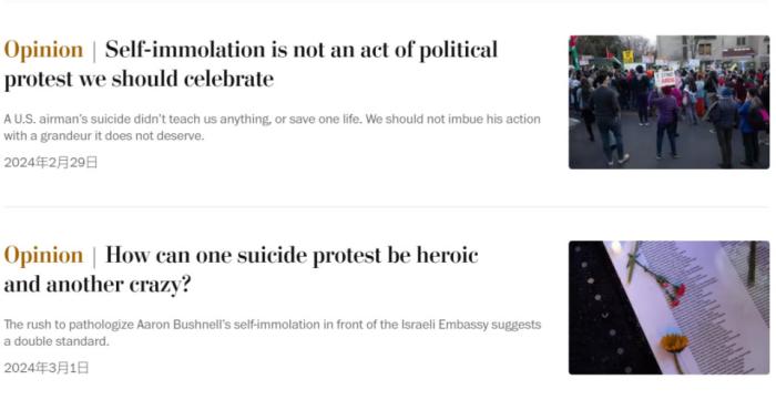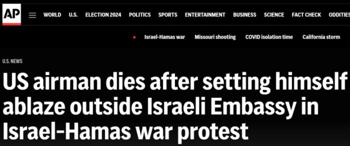 實(shí)際上,因?yàn)椴际矁?nèi)爾在直播中的話有非常多的政治標(biāo)簽,標(biāo)題想要體現(xiàn)自焚事件的原因本來是非常容易的。但在西方主流媒體的報道標(biāo)題中,最能直觀表明布什內(nèi)爾行為原因的三個關(guān)鍵詞——“加沙”(Gaza)“種族滅絕”(genocide)乃至“抗議”(protest)字樣均未出現(xiàn)。