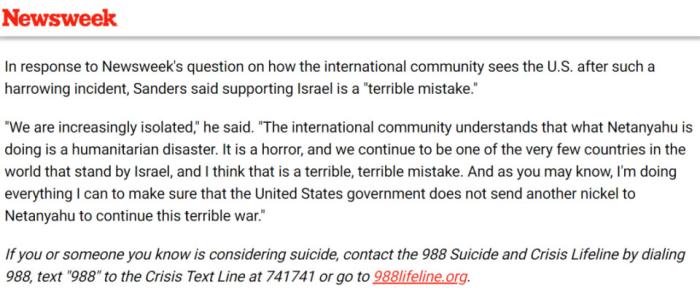另一家媒體《新聞周刊》,現(xiàn)在則會在每一篇有關(guān)布什內(nèi)爾的文章文末附上預(yù)防自殺熱線的信息。比如下面這篇文章只是關(guān)于美國左翼議員伯尼·桑德斯對布什內(nèi)爾事件的評論,內(nèi)容跟布什內(nèi)爾本人其實(shí)無甚關(guān)系,也要附上這么一段……