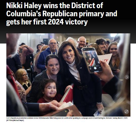 據(jù)美聯(lián)社報(bào)道,當(dāng)?shù)貢r(shí)間3日晚,華盛頓特區(qū)共和黨官員公布結(jié)果,黑利獲勝,贏得該區(qū)域所有19張代表票。